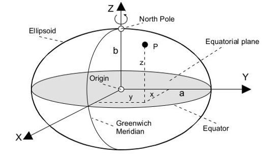 Cartesian coordinates (ECEF) defined by an ellipsoid. Image source