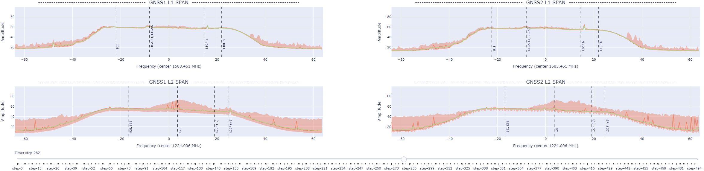 The fourth plot presents a spectrum analysis graph for each L-band generated from the UBX-MON-SPAN messages of each GNSS receiver. The user can use this plot to detect patterns of electromagnetic interference affecting the GNSS signals. The left column presents the L1 and L2 bands for the GNSS1 receiver, while the right column presents this information for the GNSS2 receiver. The plots are centered at the frequencies of each L-band, where the L1 band operates at 1575.42 MHz and the L2 band at 1227.60 MHz. The user can use the slider at the bottom of the plot to move through time slides. Note that the maximum duration of this plot is 500 seconds. This plot will not contain information after this initial period.
