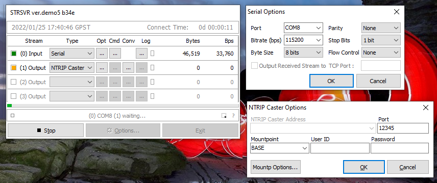 This gets the data from the serial port ttyUSB1 at baudrate 115200 (the exact string to use depends on the host system, refer to str2str documentation for other options) and offers an NTRIP caster server on port 12345 with the mountpoint name BASE (a different name can be chosen if desired).