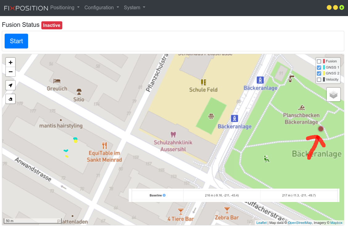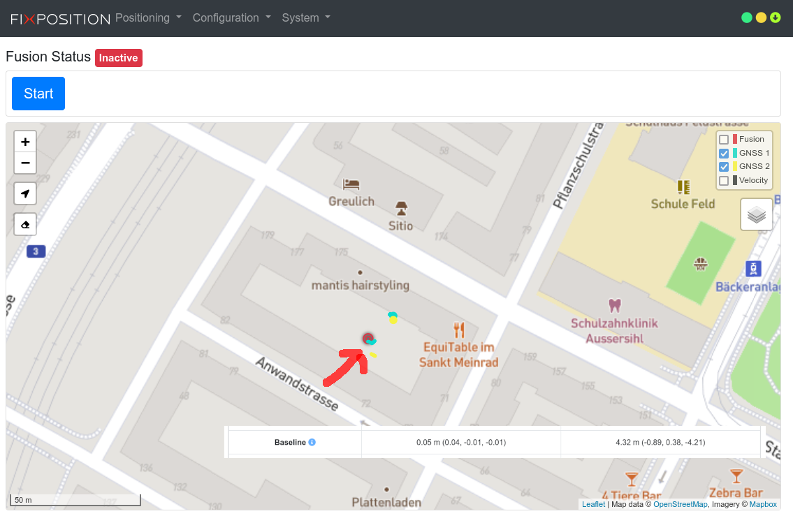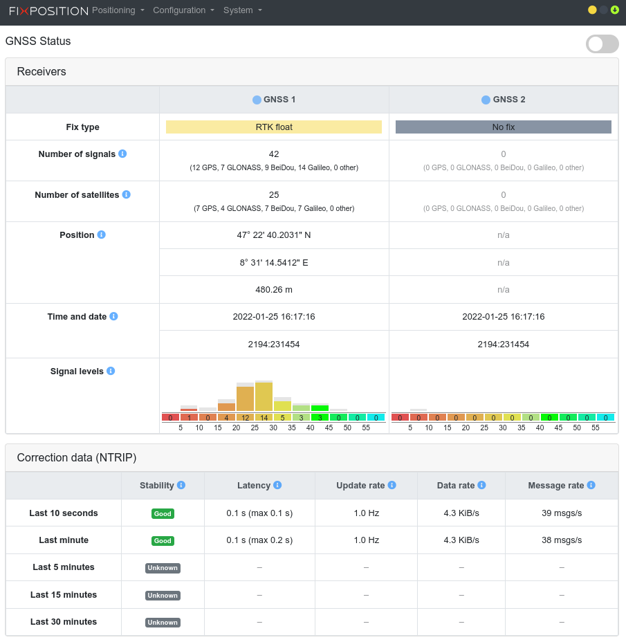 Note that the screenshot is from a bad location and the second GNSS receiver has no antenna connected. Therefore, GNSS 1 is only “RTK float” and GNSS2 has no signals or fix at all.