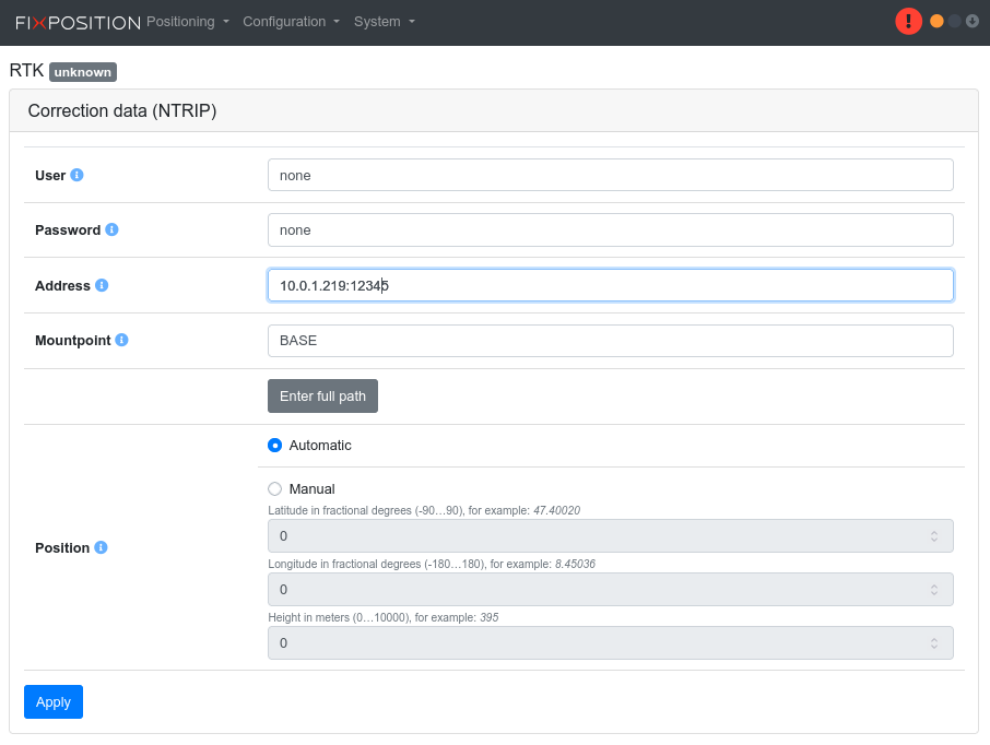 Configure the built-in NTRIP client to connect to an NTRIP caster of your choice.